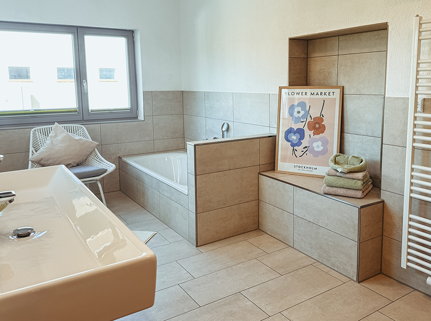 – Und ein bisschen mehr. Die Dorfplatz Suite ist sehr großzügig geschnitten und bietet dir auf rund 100m² viel Raum zum Wohlfühlen. Der offene Wohn- und Essbereich lädt zum Zusammensitzen ein, die voll ausgestattete Küche macht auch längere Aufenthalte unkompliziert. Im Schlafzimmer wartet ein großes Doppelbett auf dich, im Wohnzimmer gibt es zusätzlich eine Schlafcouch – ideal, wenn ihr zu dritt unterwegs seid. Dazu kommt ein großes Bad mit Dusche und Badewanne.