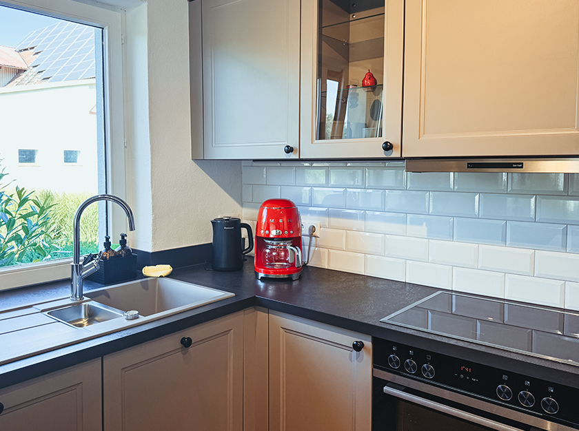Die Suite ist frisch renoviert und verbindet modernen Komfort mit der Geschichte unseres alten Bauernhauses. Früher lebte hier Oma Hilde, ein paar ihrer Lieblingsstücke haben wir bewusst erhalten. So entsteht ein Mix aus Tradition und neuen Ideen, der die Wohnung einzigartig macht. Auf dich warten ein helles Schlafzimmer mit Doppelbett, ein großzügiger Wohnbereich mit Schlafcouch, eine voll ausgestattete Küche und ein modernes Bad. Besonders schön: deine eigene Terrasse mit Blick über die Felder.
